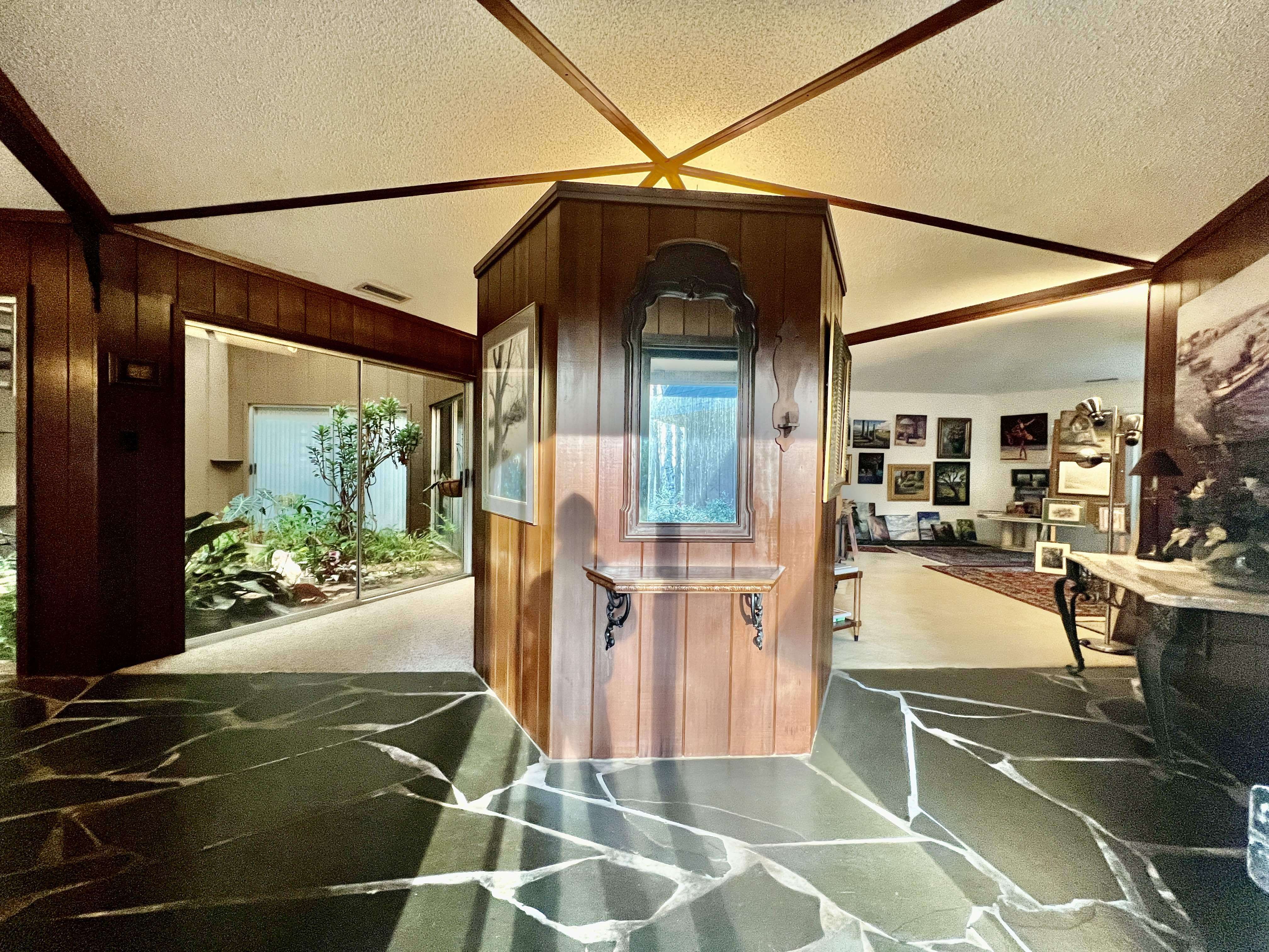 Welcome to one of the area's most iconic modernist homes, a true architectural masterpiece. Welcome to one of the area's most iconic modernist homes, a true architectural masterpiece. Nestled on nearly 3 acres in the Wakefield area of North Raleigh, 6128 Riverside Dr stands out with its striking contemporary design and distinctive hexagonal structures. Featured in NC Modernist, NC Architecture, and toured by design students for years, this home is a testament to innovative design. Highlights include a central conservatory, stunning redwood-lined ceilings, single level living, solid steel construction, along with its renowned design—makes it an ideal haven for design enthusiasts eager to restore a property brimming with potential. The expansive workshop/garage offers ample space for large equipment or could be transformed into a woodworker's dream studio. The flat, cleared backyard provides endless possibilities for recreation, gardening, or whatever your imagination desires. Additionally, there is a spacious 1,400 sqft recreation room off the back of the house (not included in the listed 3,250 sqft due to the lack of a permit). This unique room was originally built over an in-ground pool, with the possibility for future owners to remove the flooring and restore the pool, or leave it as an expansive recreation space. This is a property full of potential, offering an unparalleled opportunity to own a piece of architectural history in the heart of North Raleigh. With no HOA and no city taxes, your possibilities are truly endless.